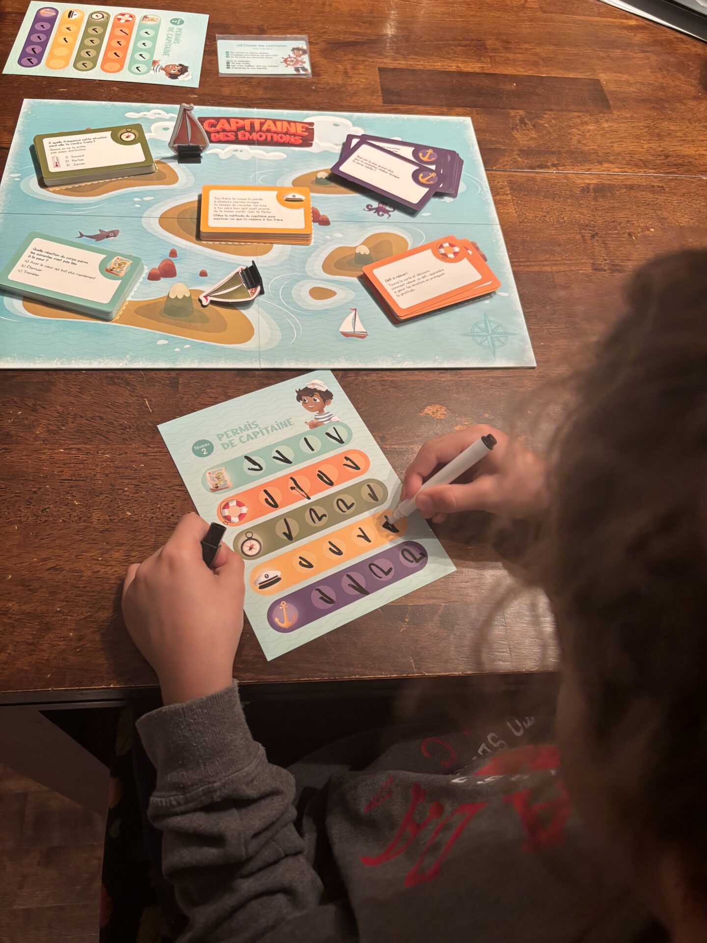 Il existe deux niveaux de difficultés et chacun peut choisir son propre niveau de difficulté pour la partie. Le but est de répondre aux questions et d’amasser des points sur notre permis de capitaine. La première personne qui remplit son permis gagne la partie. Les points sont déterminés par les cartes. Il est extrêmement rare que quelqu’un n’obtienne pas de point à son tour de jeu car les défis sont principalement basés sur des partages. Ce qui évite la compétition et permet réellement les partages authentiques. Le tout vient avec un guide pédagogique très pertinent à l’intention des adultes et les cartes contiennent toutes des explications, ce qui en fait un jeu très riche.